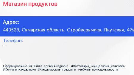 Магазин продуктов по адресу 443528, Самарская область, Стройкерамика, Якутская, 47а в дальнейшем Организация, размещена в следующих категориях: