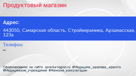 Продуктовый магазин по адресу 443050, Самарская область, Стройкерамика, Арзамасская, 123а в дальнейшем Организация, размещена в следующих категориях: