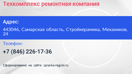Техкомплекс, ремонтная компания по адресу 443046, Самарская область, Стройкерамика, Механиков, 24 в дальнейшем Организация, размещена в следующих категориях: