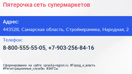 Пятерочка, сеть супермаркетов по адресу 443528, Самарская область, Стройкерамика, Народная, 2 в дальнейшем Организация, размещена в следующих категориях: