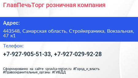 ГлавПечьТорг, розничная компания по адресу 443548, Самарская область, Стройкерамика, Вокзальная, 47 к1 в дальнейшем Организация, размещена в следующих категориях: