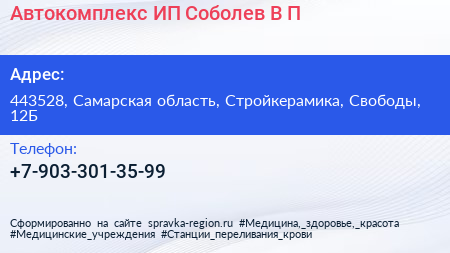 Автокомплекс, ИП Соболев В.П. по адресу 443528, Самарская область, Стройкерамика, Свободы, 12Б в дальнейшем Организация, размещена в следующих категориях: