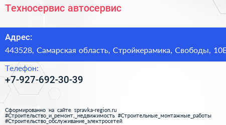 Техносервис, автосервис по адресу 443528, Самарская область, Стройкерамика, Свободы, 10Б в дальнейшем Организация, размещена в следующих категориях: