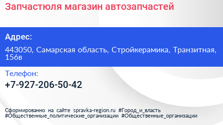 Запчастюля, магазин автозапчастей по адресу 443050, Самарская область, Стройкерамика, Транзитная, 156в в дальнейшем Организация, размещена в следующих категориях: