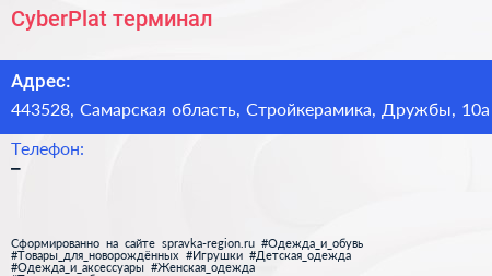 CyberPlat, терминал по адресу 443528, Самарская область, Стройкерамика, Дружбы, 10а в дальнейшем Организация, размещена в следующих категориях: