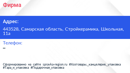 Фирма по адресу 443528, Самарская область, Стройкерамика, Школьная, 11а в дальнейшем Организация, размещена в следующих категориях: