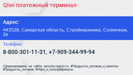 Qiwi, платежный терминал по адресу 443528, Самарская область, Стройкерамика, Солнечная, 2в в дальнейшем Организация, размещена в следующих категориях: