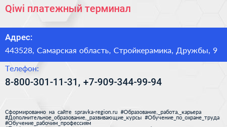 Qiwi, платежный терминал по адресу 443528, Самарская область, Стройкерамика, Дружбы, 9 в дальнейшем Организация, размещена в следующих категориях: