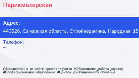 Парикмахерская по адресу 443528, Самарская область, Стройкерамика, Народная, 15 в дальнейшем Организация, размещена в следующих категориях: