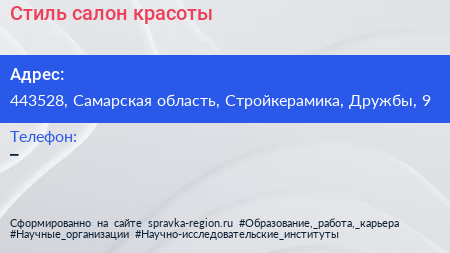 Стиль, салон красоты по адресу 443528, Самарская область, Стройкерамика, Дружбы, 9 в дальнейшем Организация, размещена в следующих категориях: