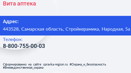 Вита, аптека по адресу 443528, Самарская область, Стройкерамика, Народная, 5а в дальнейшем Организация, размещена в следующих категориях: