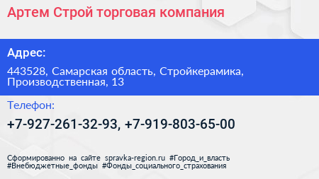 Артем Строй, торговая компания по адресу 443528, Самарская область, Стройкерамика, Производственная, 13 в дальнейшем Организация, размещена в следующих категориях: