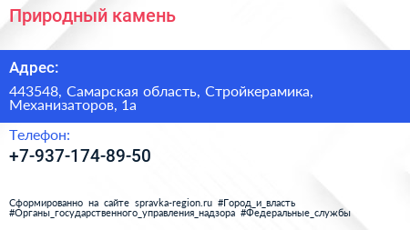 Природный камень по адресу 443548, Самарская область, Стройкерамика, Механизаторов, 1а в дальнейшем Организация, размещена в следующих категориях: