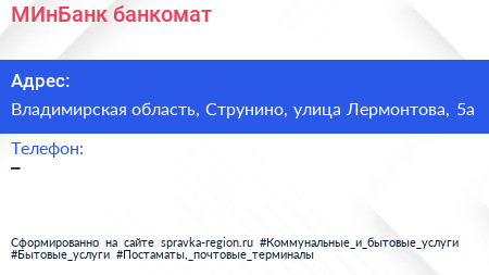 МИнБанк, банкомат по адресу Владимирская область, Струнино, улица Лермонтова, 5а в дальнейшем Организация, размещена в следующих категориях: