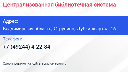 Централизованная библиотечная система по адресу Владимирская область, Струнино, Дубки квартал, 16 в дальнейшем Организация, размещена в следующих категориях: