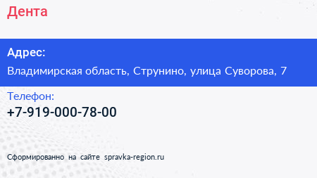 Дента+ по адресу Владимирская область, Струнино, улица Суворова, 7 в дальнейшем Организация, размещена в следующих категориях: