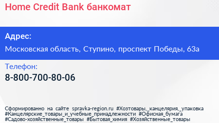 Home Credit Bank, банкомат по адресу Московская область, Ступино, проспект Победы, 63а в дальнейшем Организация, размещена в следующих категориях: