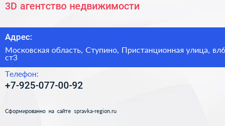 3D, агентство недвижимости по адресу Московская область, Ступино, Пристанционная улица, вл6 ст3 в дальнейшем Организация, размещена в следующих категориях: