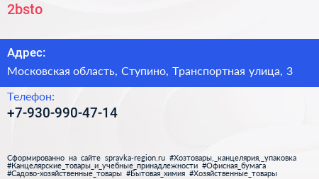 2bsto по адресу Московская область, Ступино, Транспортная улица, 3 в дальнейшем Организация, размещена в следующих категориях: