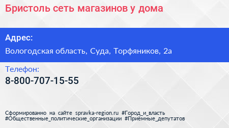 Бристоль, сеть магазинов у дома по адресу Вологодская область, Суда, Торфяников, 2а в дальнейшем Организация, размещена в следующих категориях: