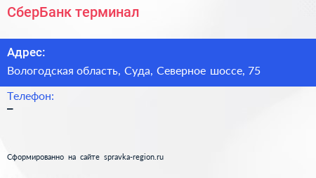 СберБанк, терминал по адресу Вологодская область, Суда, Северное шоссе, 75 в дальнейшем Организация, размещена в следующих категориях: