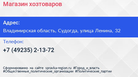 Магазин хозтоваров по адресу Владимирская область, Судогда, улица Ленина, 32 в дальнейшем Организация, размещена в следующих категориях: