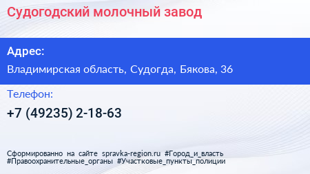 Судогодский молочный завод по адресу Владимирская область, Судогда, Бякова, 36 в дальнейшем Организация, размещена в следующих категориях: