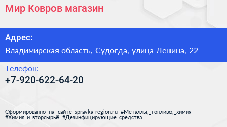 Мир Ковров, магазин по адресу Владимирская область, Судогда, улица Ленина, 22 в дальнейшем Организация, размещена в следующих категориях: