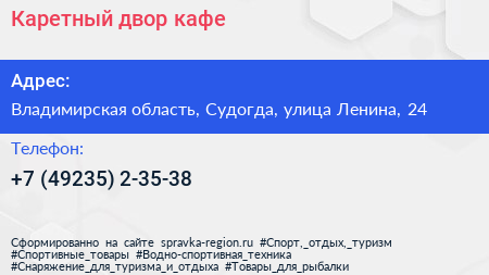 Каретный двор, кафе по адресу Владимирская область, Судогда, улица Ленина, 24 в дальнейшем Организация, размещена в следующих категориях: