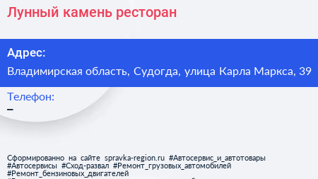 Лунный камень, ресторан по адресу Владимирская область, Судогда, улица Карла Маркса, 39 в дальнейшем Организация, размещена в следующих категориях: