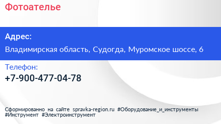 Фотоателье по адресу Владимирская область, Судогда, Муромское шоссе, 6 в дальнейшем Организация, размещена в следующих категориях: