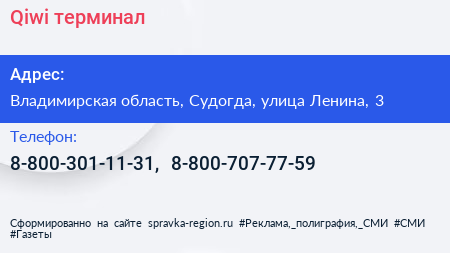 Qiwi, терминал по адресу Владимирская область, Судогда, улица Ленина, 3 в дальнейшем Организация, размещена в следующих категориях:
