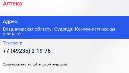 Аптека по адресу Владимирская область, Судогда, Коммунистическая улица, 6 в дальнейшем Организация, размещена в следующих категориях: