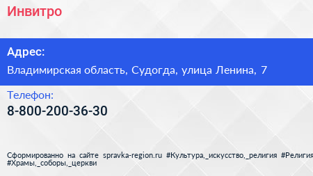 Инвитро по адресу Владимирская область, Судогда, улица Ленина, 7 в дальнейшем Организация, размещена в следующих категориях:
