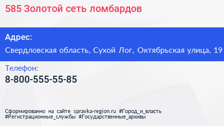 585*Золотой, сеть ломбардов по адресу Свердловская область, Сухой Лог, Октябрьская улица, 19 в дальнейшем Организация, размещена в следующих категориях: