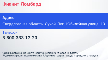 Фианит-Ломбард по адресу Свердловская область, Сухой Лог, Юбилейная улица, 13 в дальнейшем Организация, размещена в следующих категориях: