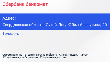 Сбербанк, банкомат по адресу Свердловская область, Сухой Лог, Юбилейная улица, 20 в дальнейшем Организация, размещена в следующих категориях: