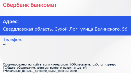 Сбербанк, банкомат по адресу Свердловская область, Сухой Лог, улица Белинского, 56 в дальнейшем Организация, размещена в следующих категориях: