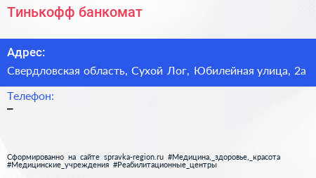 Тинькофф, банкомат по адресу Свердловская область, Сухой Лог, Юбилейная улица, 2а в дальнейшем Организация, размещена в следующих категориях: