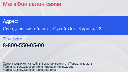 МегаФон, салон связи по адресу Свердловская область, Сухой Лог, Кирова, 22 в дальнейшем Организация, размещена в следующих категориях: