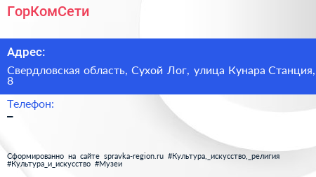 ГорКомСети по адресу Свердловская область, Сухой Лог, улица Кунара Станция, 8 в дальнейшем Организация, размещена в следующих категориях: