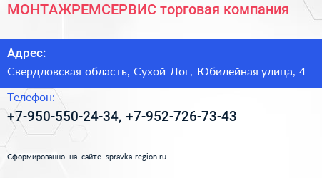 МОНТАЖРЕМСЕРВИС, торговая компания по адресу Свердловская область, Сухой Лог, Юбилейная улица, 4 в дальнейшем Организация, размещена в следующих категориях: