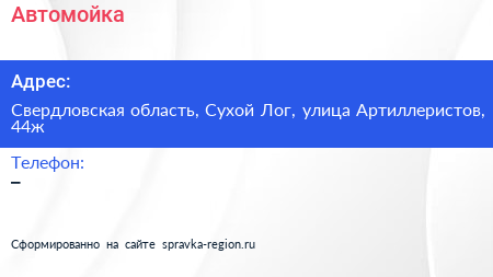 Автомойка по адресу Свердловская область, Сухой Лог, улица Артиллеристов, 44ж в дальнейшем Организация, размещена в следующих категориях: