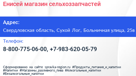 Енисей, магазин сельхоззапчастей по адресу Свердловская область, Сухой Лог, Больничная улица, 25в в дальнейшем Организация, размещена в следующих категориях: