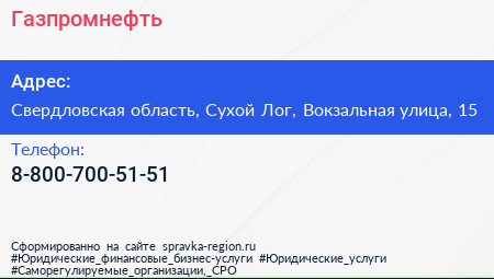 Газпромнефть по адресу Свердловская область, Сухой Лог, Вокзальная улица, 15 в дальнейшем Организация, размещена в следующих категориях: