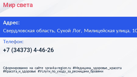Мир света по адресу Свердловская область, Сухой Лог, Милицейская улица, 10 в дальнейшем Организация, размещена в следующих категориях: