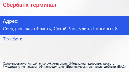 Сбербанк, терминал по адресу Свердловская область, Сухой Лог, улица Горького, 8 в дальнейшем Организация, размещена в следующих категориях: