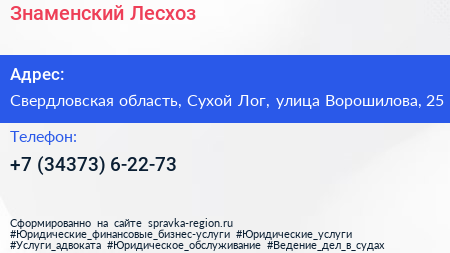 Знаменский Лесхоз по адресу Свердловская область, Сухой Лог, улица Ворошилова, 25 в дальнейшем Организация, размещена в следующих категориях:
