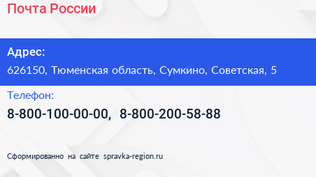 Почта России по адресу 626150, Тюменская область, Сумкино, Советская, 5 в дальнейшем Организация, размещена в следующих категориях: