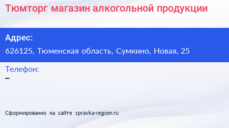 Тюмторг, магазин алкогольной продукции по адресу 626125, Тюменская область, Сумкино, Новая, 25 в дальнейшем Организация, размещена в следующих категориях:
